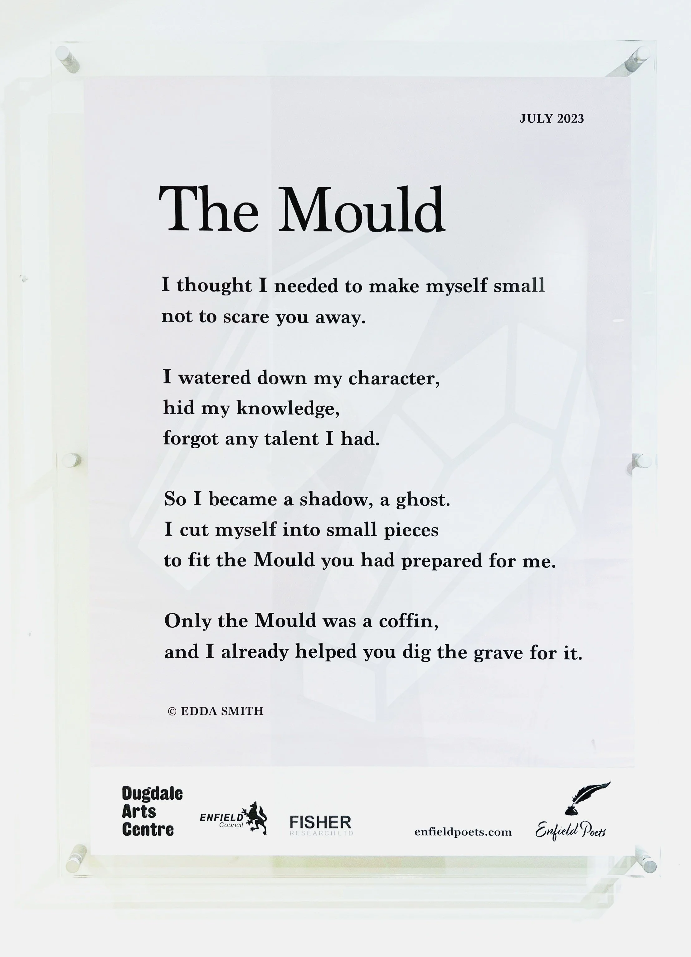 "The Mould" was chosen as poem of the month by the Enfield Poets Society in July 2023 from my collection "Between Light and Shadow."